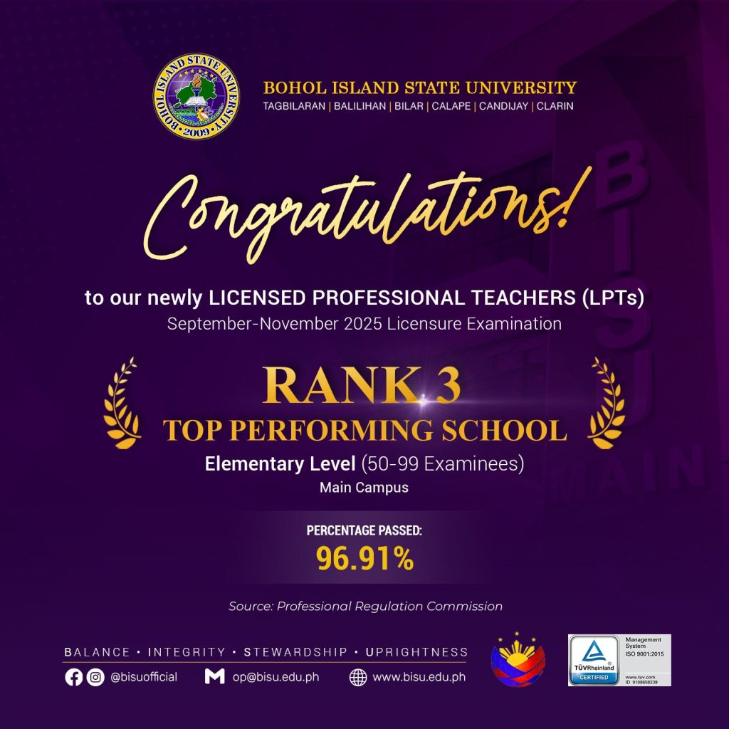 BISU proudly raises the banner of academic excellence as it once again emerges as a Top Performing School in the Philippines with the latest results of the September–November 2025 Licensure Examination for Professional Teachers!